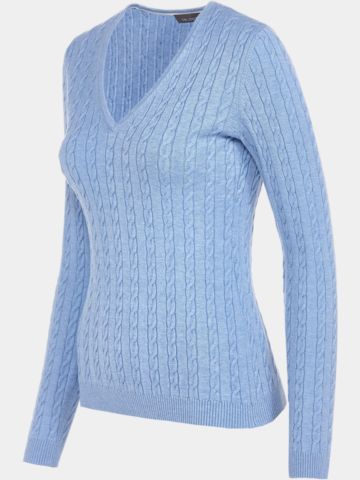 Dámský pletený svetr Valiente s výstřihem do V a vzorem kabelového úpletu kombinuje eleganci s výjimečným pohodlím. Exkluzivní povrchová úprava zajišťuje měkký a příjemný pocit a je ideální pro nejvyšší nároky na golfovém hřišti i ve volném čase. Tento svetr s nadčasovým designem musí mít každá golfistka, která si cení nejvyšší kvality a klasické elegance. Výraz exkluzivity - zažijte luxus v každém detailu.